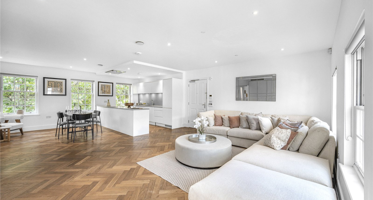 Comprised of a spacious open plan living space with fully integrated kitchen, dining and lounge area leading to balcony. Principal bedroom with ensuite bathroom, 2nd double bedroom and 3rd bedroom/ study with the flexibility to be a dressing room for the 2nd bedroom.