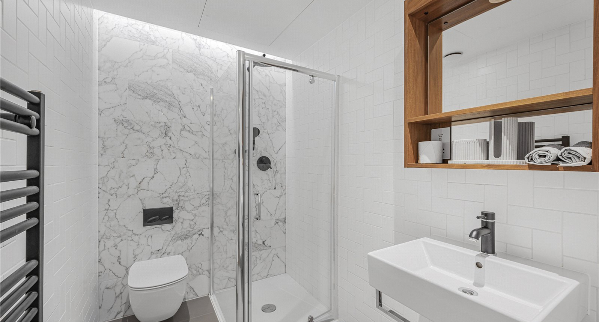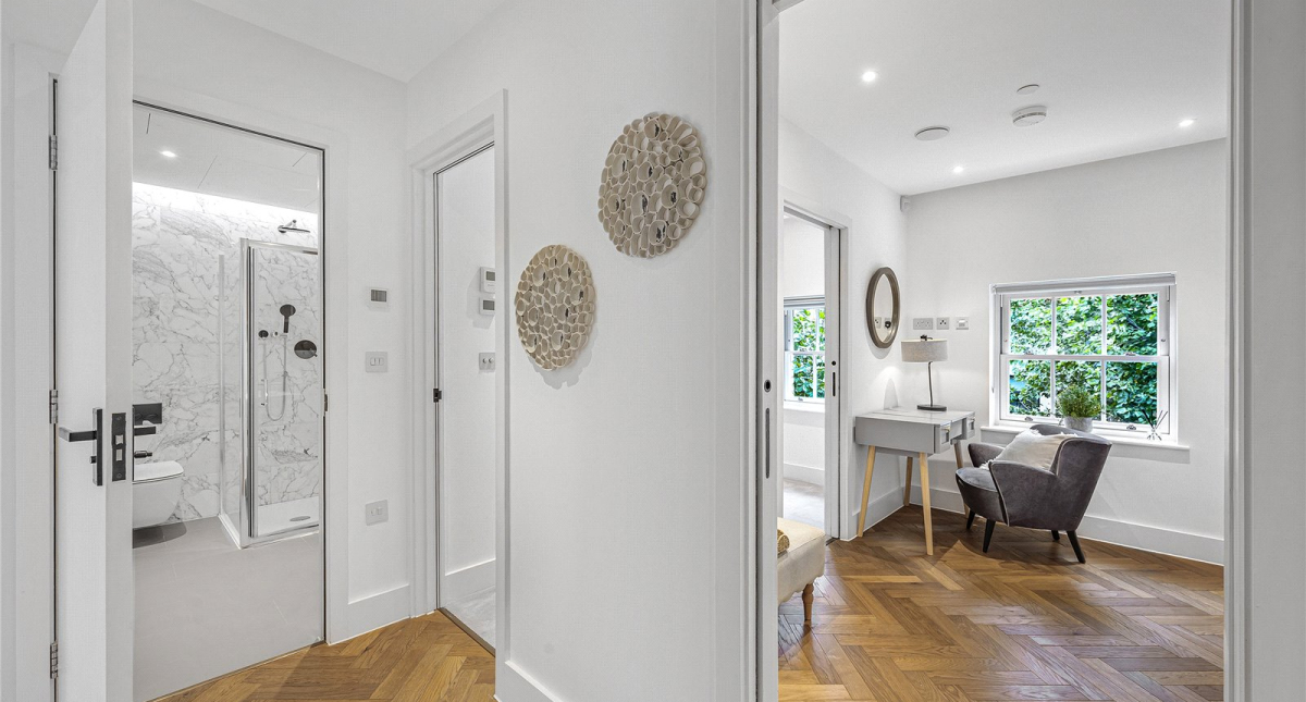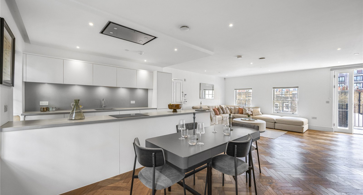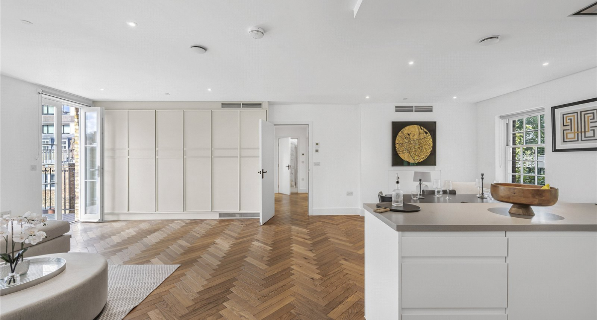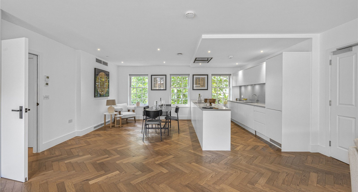 Comprised of a spacious open plan living space with fully integrated kitchen, dining and lounge area leading to balcony. Principal bedroom with ensuite bathroom, 2nd double bedroom and 3rd bedroom/ study with the flexibility to be a dressing room for the 2nd bedroom.