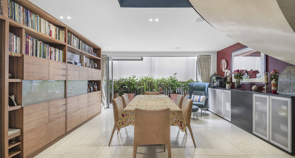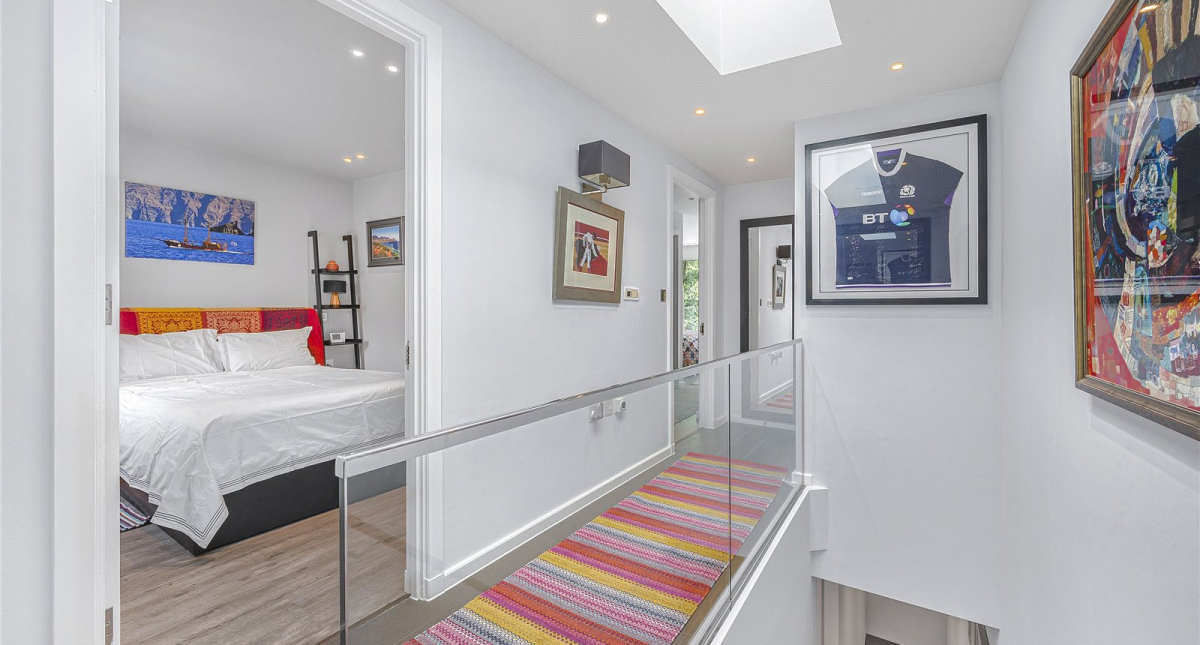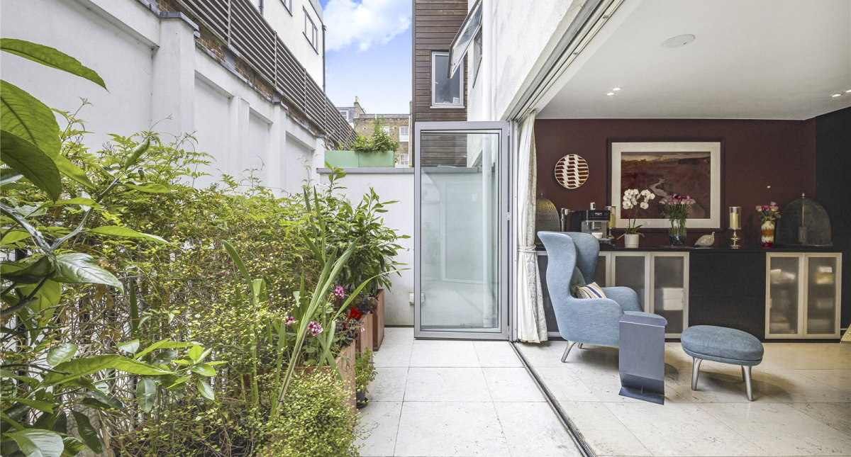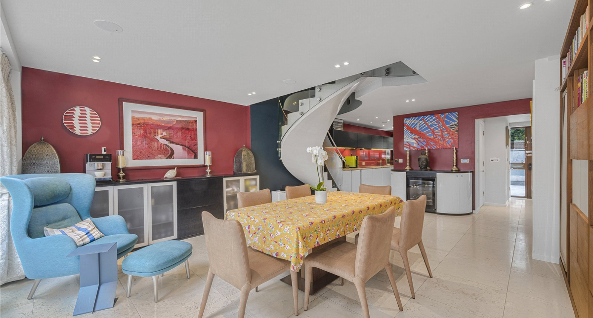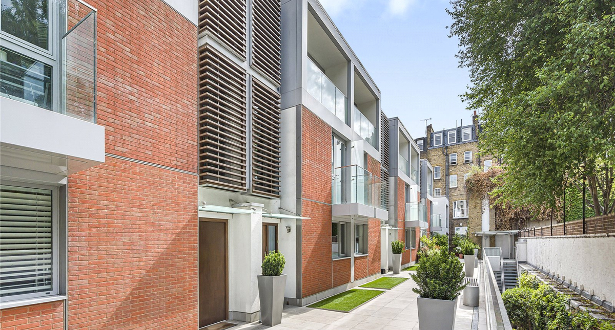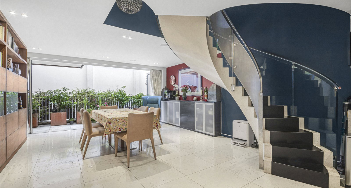 Modern three-bedroom townhouse set within a secure gated mews just off Charlotte Street featuring a striking sweeping staircase.